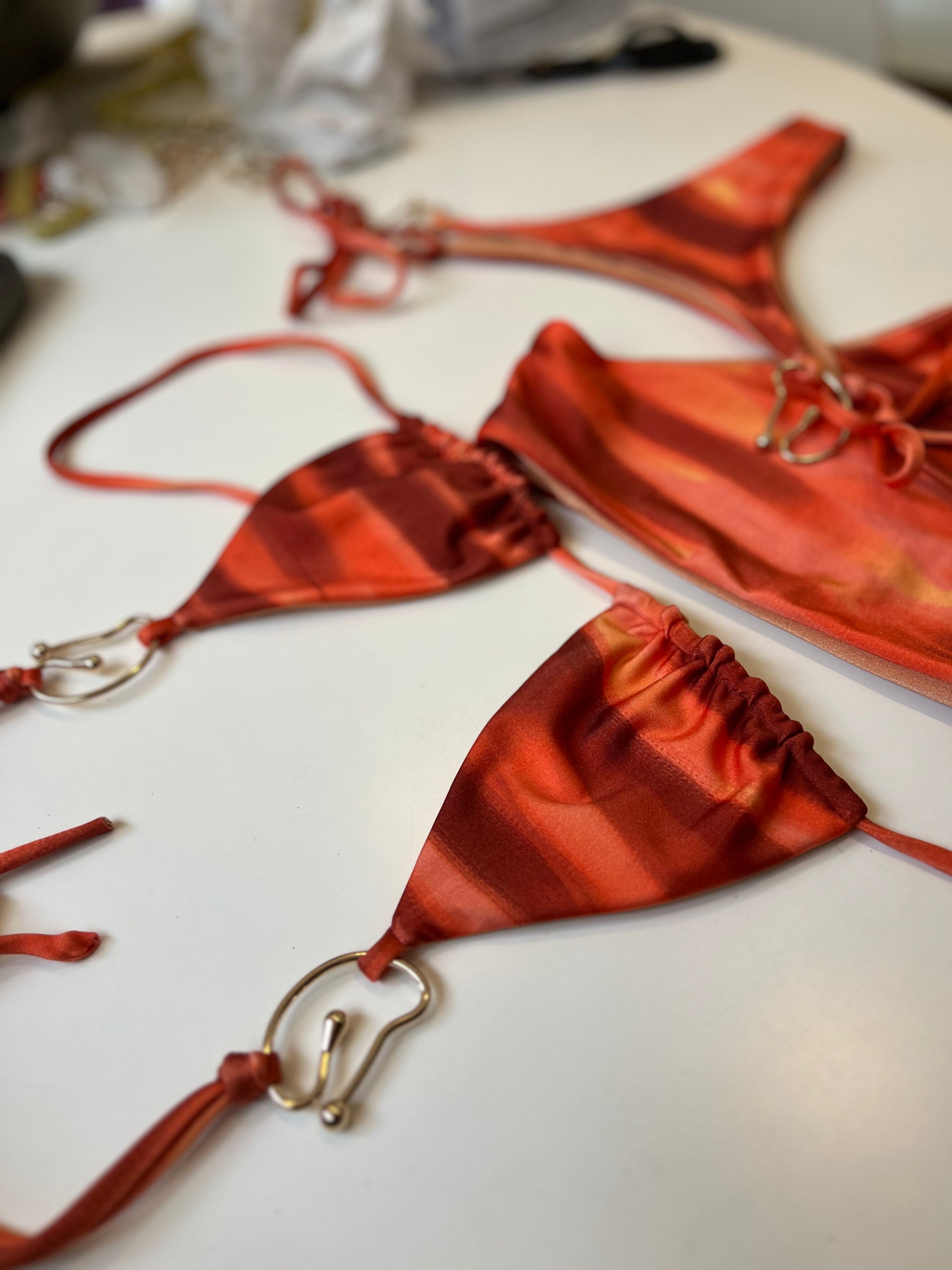 Cut from soft, quick-drying stretch fabric in sunset tones, it hugs the body like a second skin.